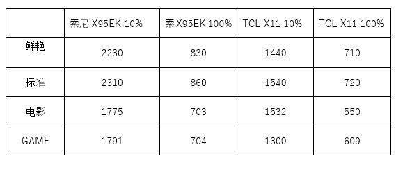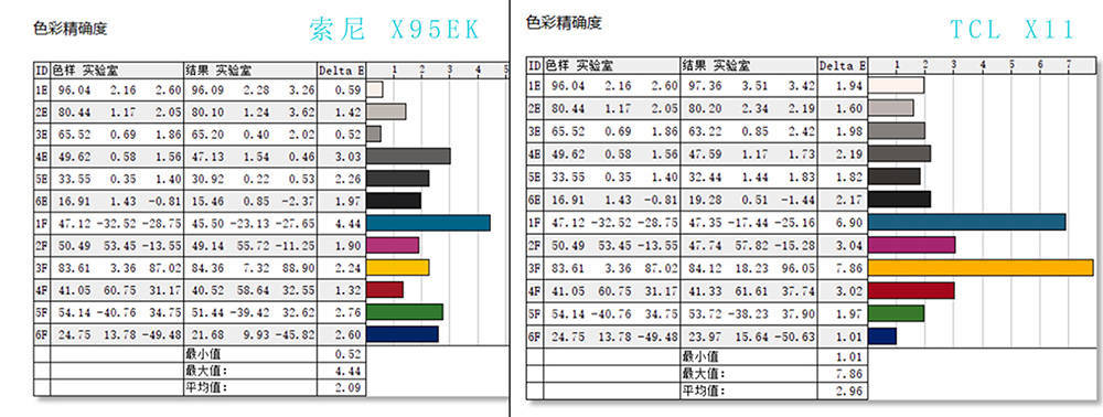 在电影模式下测得:索尼X95EK色准平均值为2.09,TCL X10色准平均值为2.96,两台电视色准表现都很优秀。