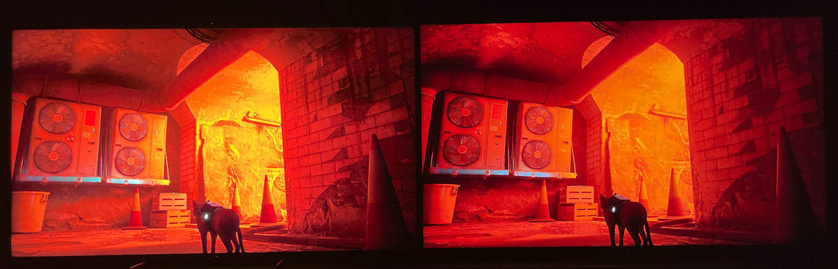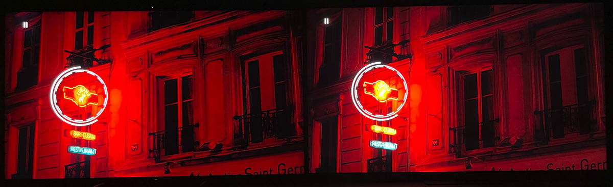左索尼X95EK 右TCL X11,在考验对比度表现的画面中,X95EK展现了更多暗部细节,而TCL X11在霓虹灯的高光区域有更高的亮度表现。