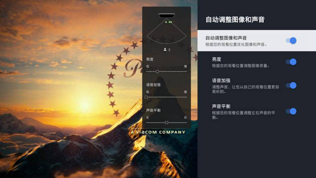 ·当观看者集中在某一侧或者均匀分布的话,它会根据观众的位置调整声音的平衡。屏幕上摄像头示意图中的小绿点会根据识别出来的人数而变化,而声音平衡会根据观众所在位置进行偏移调整,来适应观众的最佳听音感受;