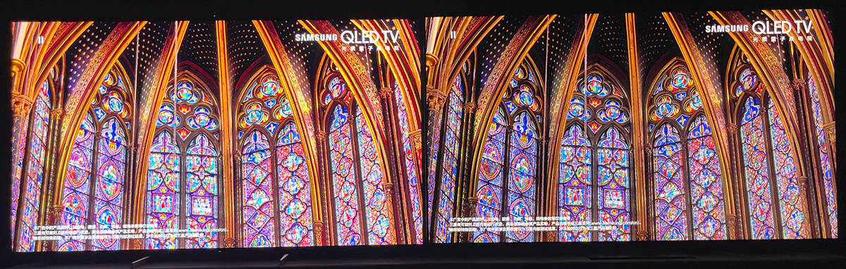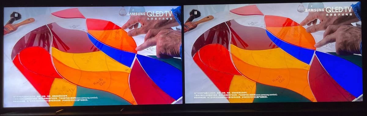 左索尼X95EK 右TCL X11,彩色玻璃在X95EK上更鲜亮一些,而且X95EK展现的人手肤色更加自然真实