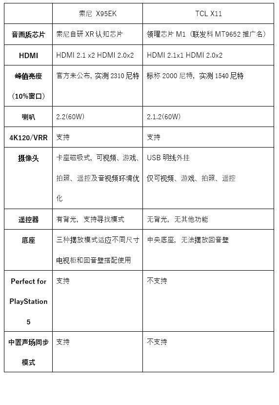 首先我们看一下索尼X95EK和TCL X11的基本硬件参数: