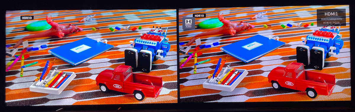 全屏模式下两者HDR亮度都很足够,但是当出现类似日出日落逆光画面或者游戏电影中爆炸画面的时候,电视画面局部出现明显高亮的点光源爆发高光的时候,索尼X95EK还是有比较明显的优势的,X95EK可以表现出更接近真实世界的视觉真实感。