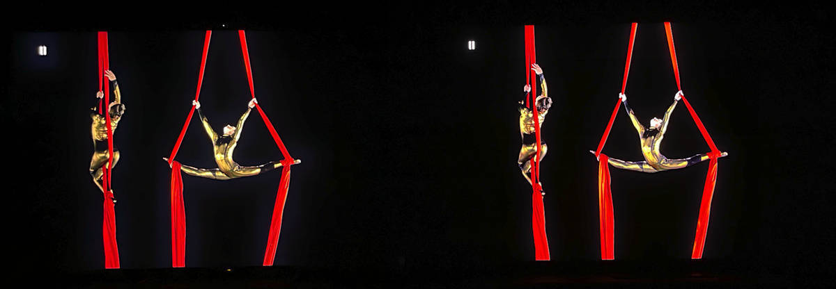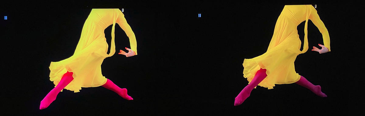 左索尼X95EK 右TCL X11,在单色的裙子和袜子表现力上是十分考验电视的色彩能力,慢动作的画面下两台电视都没有出现常见入门级电视可能出现的涂抹感,细节还原能力都很好,而X95EK更好的表现了光线从左上方照下来的自然过渡