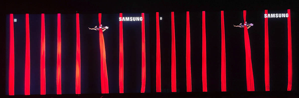 左索尼X95EK 右TCL X11,这个缎带下落的画面中,相邻缎带之间在X95EK上也出现了淡淡的光晕