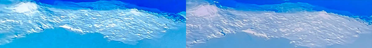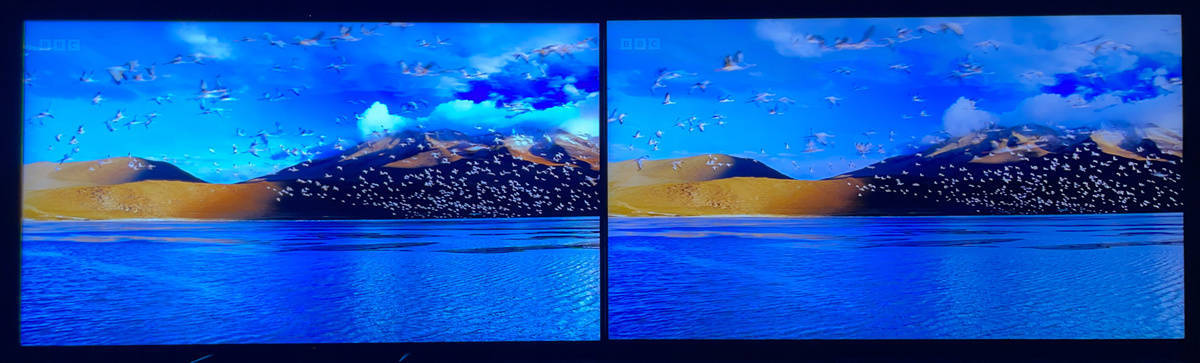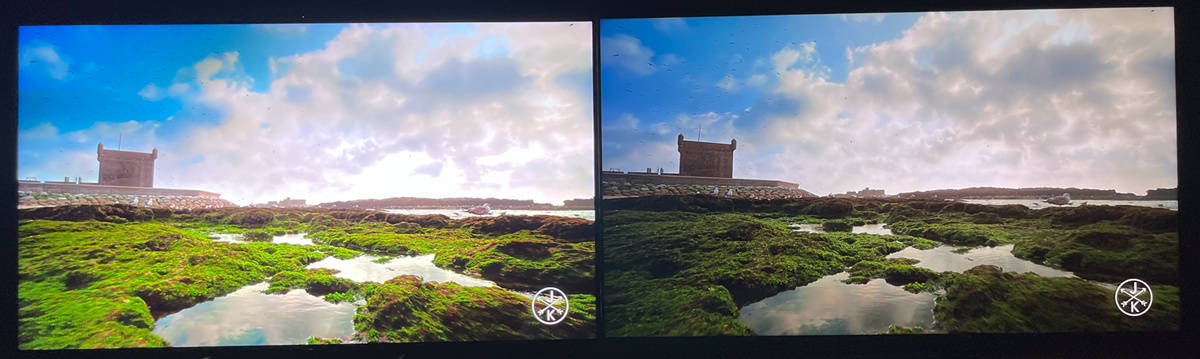 左索尼X95EK 右TCL X11,湖面波光粼粼的感觉和远处云朵的层次感都凸显出来了,索尼在处理画面细节加强的经验上还是相当稳妥的