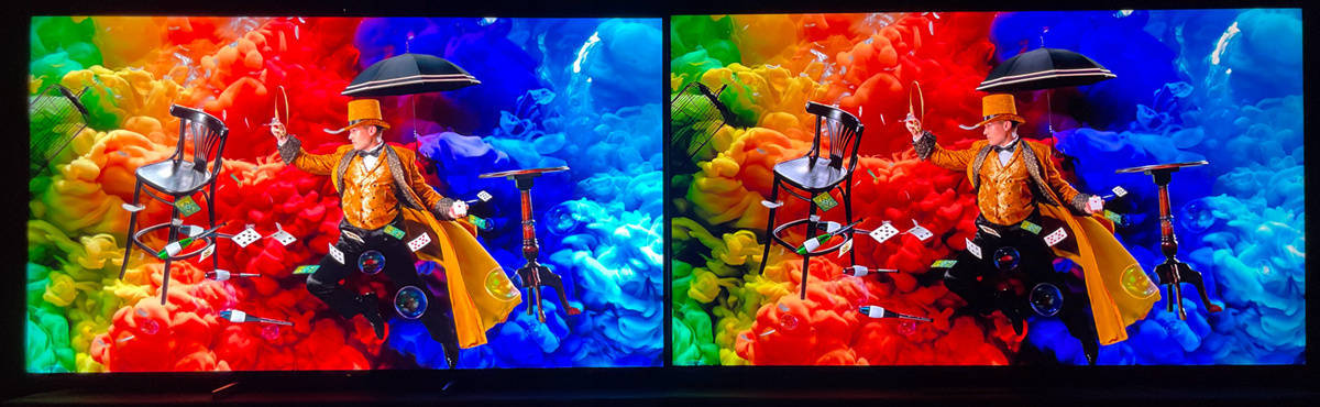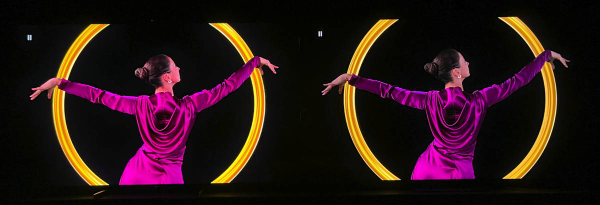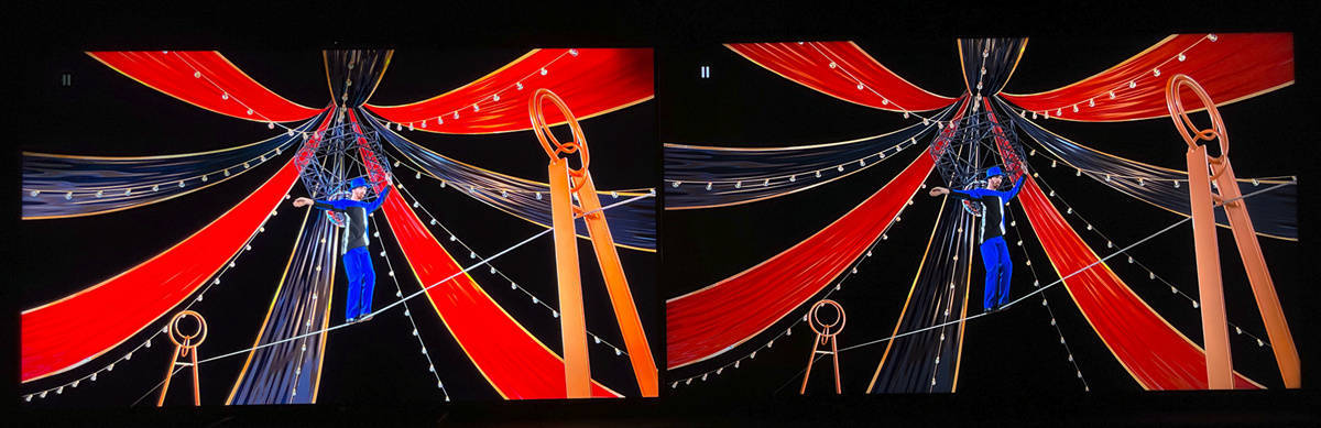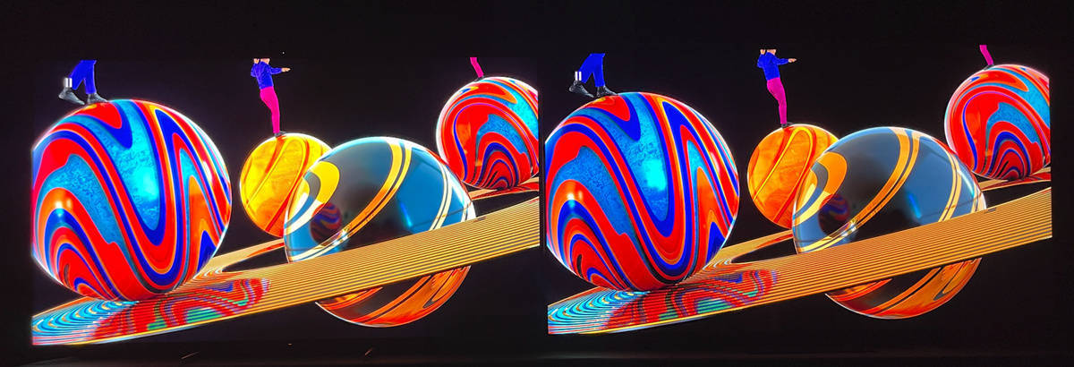 左索尼X95EK 右TCL X11,在这种高光和黑位大反差的画面中,索尼X95EK因为有着明显的高光区域亮度优势,对于一些视觉敏感的人可能会在高光区域的边缘出现一些光晕现象,如下图所示(拉长曝光时间后)纯黑区域尤其是在人物和彩色泡泡的轮廓边缘出看到一些轻微的灰白色,而不是其他黑色区域那种干干净净的纯黑,但这种情况一般也非常不明显,除非像这样的极限情况才可能会被人注意到,而下图的画面也仅是相机故意长曝光会拍下来,正常拍照和实际人眼观看并不会看到这么特别明显的光晕情况。