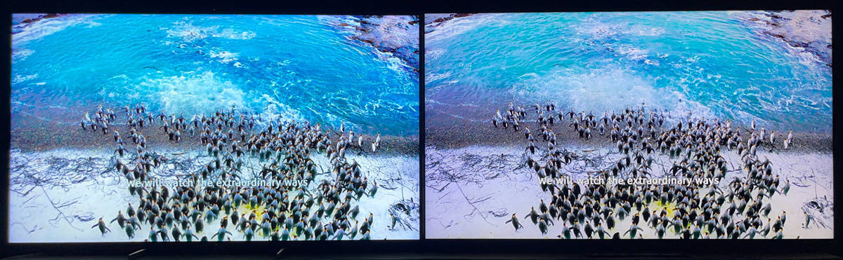 左索尼X95EK 右TCL X11,企鹅跳入水中溅起的水花在索尼X95EK上更有立体感