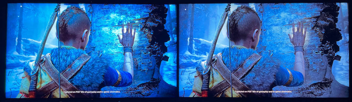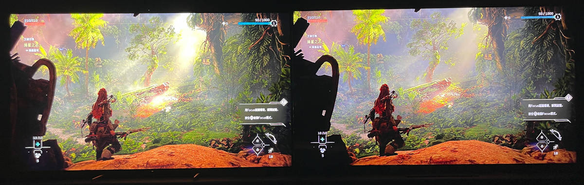 左索尼X95EK 右TCL X11,在《地平线》游戏的洞口画面中,洒下的阳光不是X11那样淡淡的,而是被遮挡后有不同亮度的光团的视觉效果,玩起来像是两个游戏