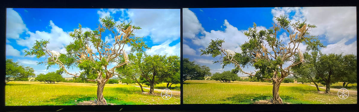 左索尼X95EK 右TCL X11,在索尼X95EK上不仅草皮植被色彩更真实,远处天空的白云也有着更接近真实的天空的观感,X11的天空则有点霾的感觉