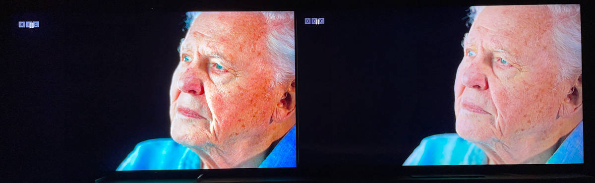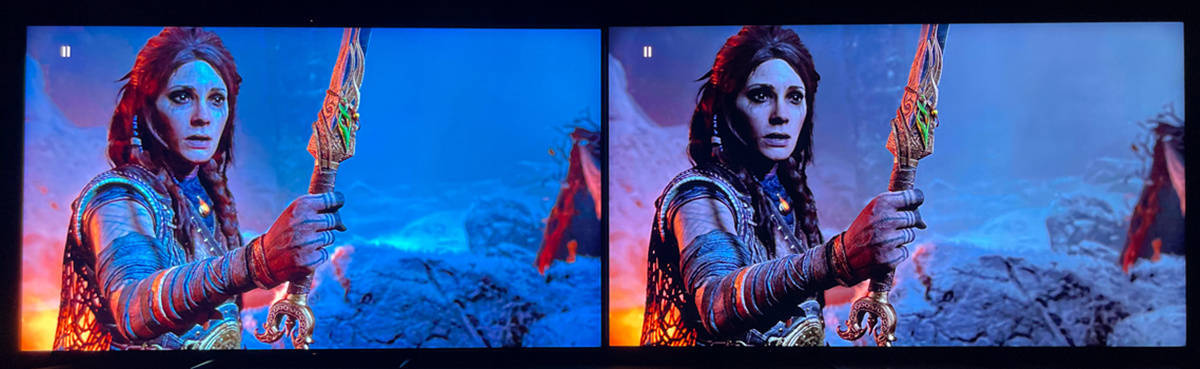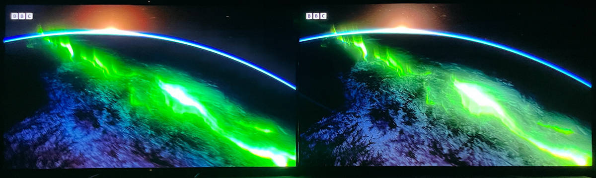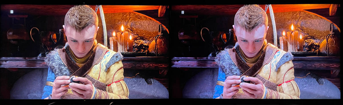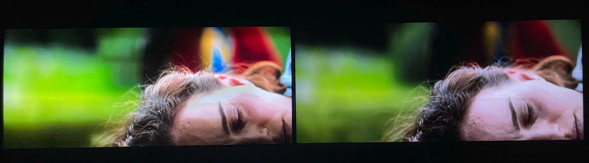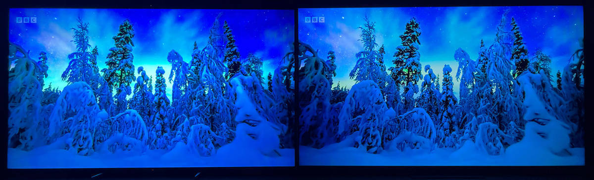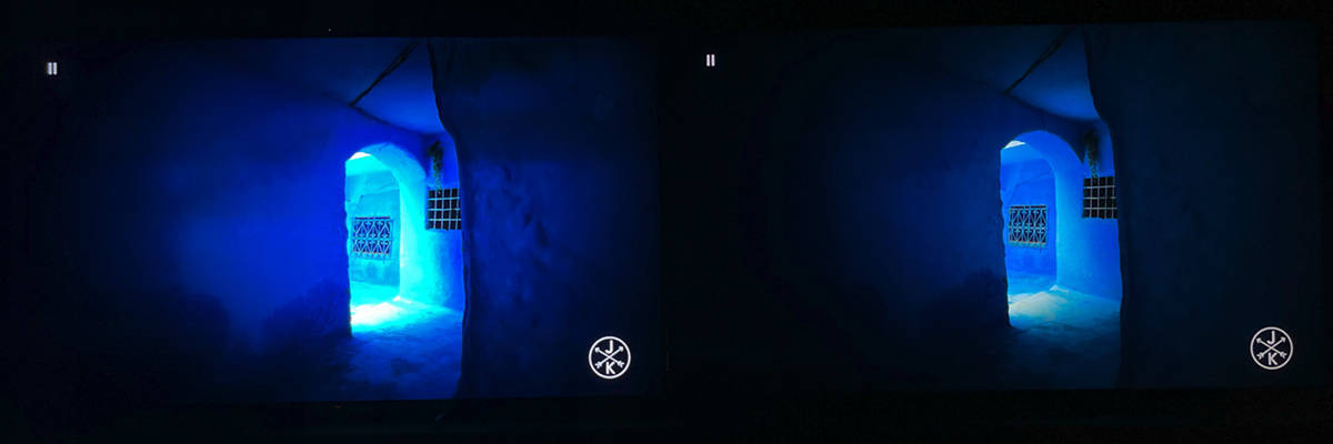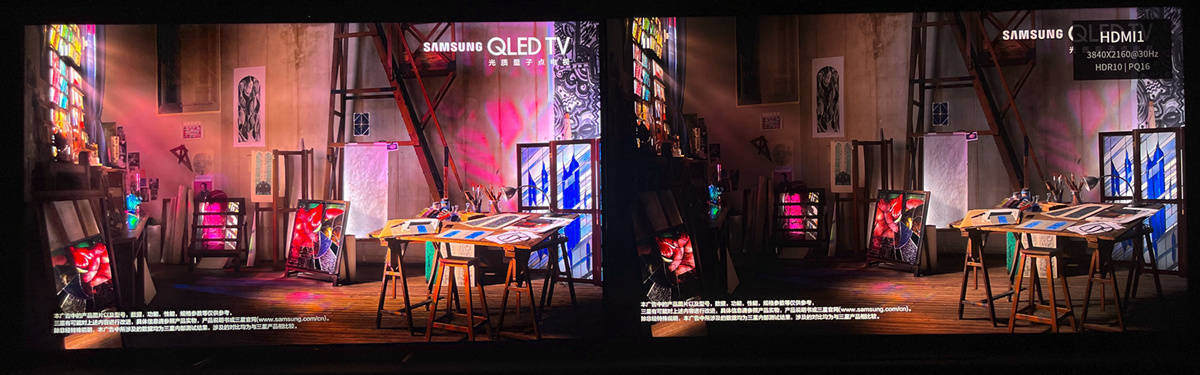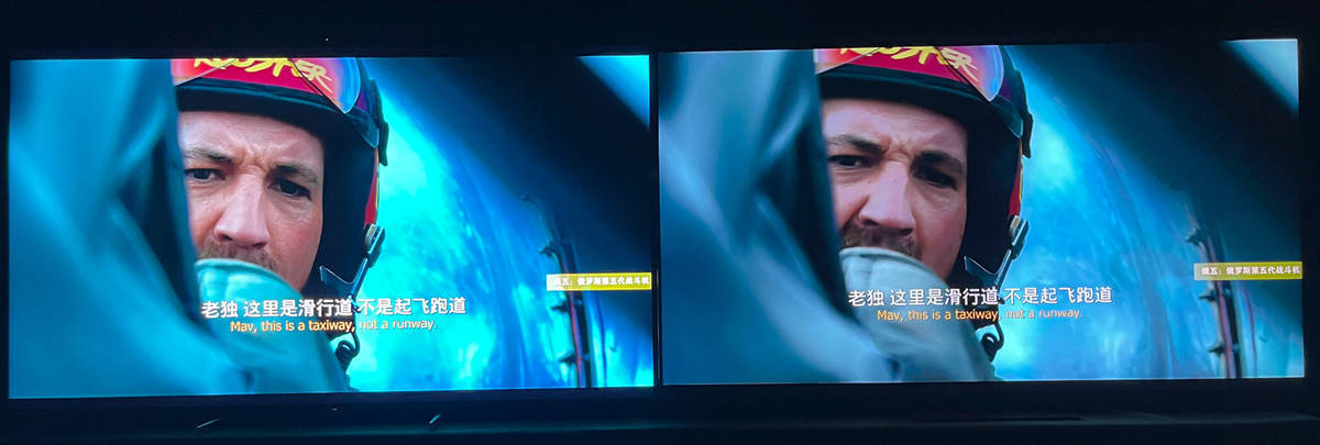 左索尼X95EK 右TCL X11,在X95EK上的人物边缘有淡淡的光晕,而TCL X11的黑位控制的十分稳定,但是这也跟X11的峰值亮度比X95EK低了不少有着明显关系,如果把X95EK调整到亮度较低的电影模式则可以大大改善光晕现象的出现。