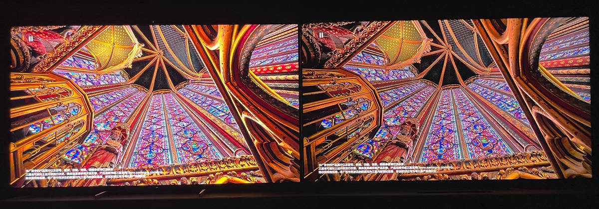左索尼X95EK 右TCL X11,教堂内不仅玻璃的色彩层次丰富饱满,墙面和天棚立柱的金色也有着更丰富的色彩和颜色过渡,高光区域表现力好出一大截。