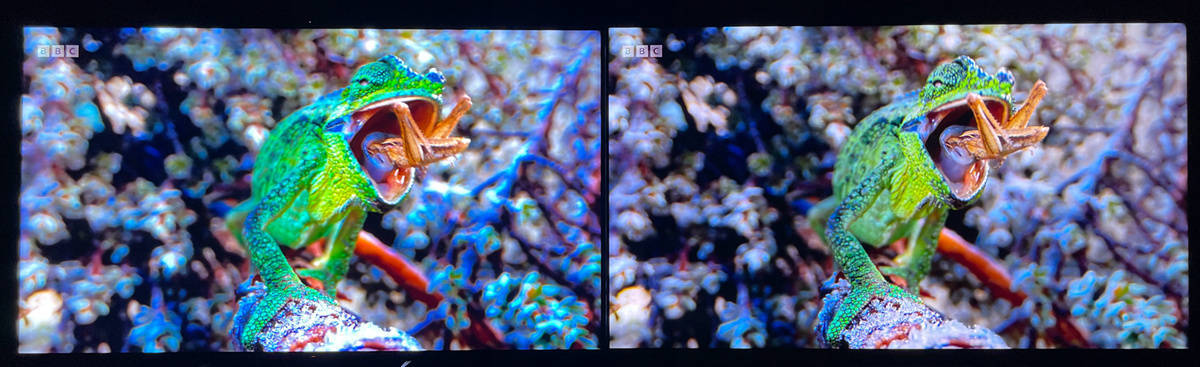 左索尼X95EK 右TCL X11,不管是前景蜥蜴还是背景岩石上的植被都是在索尼X95EK上有着更强烈的色彩,更真实。这得益于索尼XR认知芯片为用户带来与众不同的逼真体验。传统图像处理技术进行画质优化时,仅能对色彩、对比度、画面细节等元素进行单独检测、分析;而XR认知芯片则模拟的人脑的认知习惯,当我们观看物体时,视线会集中在一些聚焦点上,在认知智能的驱动下,XR认知芯片可以侦测到用户视线聚焦点在图像中所对应的位置,并对这些图像进行综合分析。索尼的XR动态背光系统大师版和XR对比度增强旗舰版技术让画面层次感更高,该黑的地方黑下去,该亮的地方亮起来,并且在黑位和高光的区域尽可能多的保留更多的画面细节。
