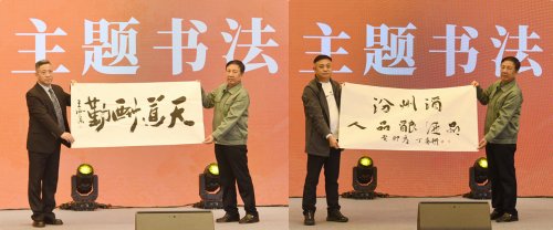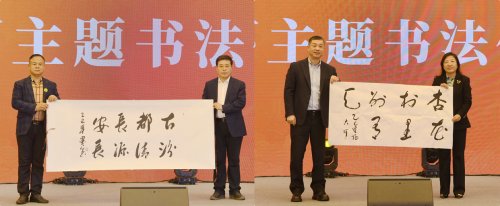 汾阳市人大常委会副主任雷成才,汾阳市政协副主席武艳花代表汾阳市接受汾清天下主题书法作品赠送