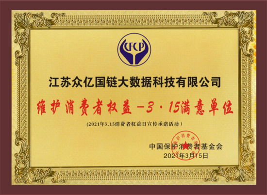在2021年3•15国际消费者权益日之际,中国保护消费者基金会开展了“2021维护消费者权益—3•15满意品牌(单位)”宣传承诺活动;经过多轮评审与筛选,江苏众亿国链大数据科技有限公司凭借突出的企业实力、技术优势和卓越的产品优势,国链云●太湖系列分布式云存储服务器荣获中国保护消费者基金会授予的“维护消费者权益—3•15满意单位”称号。