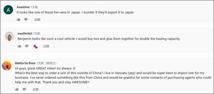 treelife365: Benjamin looks like such a cool vehicle! I would buy two and glue them together for double the hauling capacity.本杰明看起来像一辆很酷的车!我会买两个并将它们粘在一起以获得双倍的牵引能力。(注:本杰明是视频中车辆评测员给“橙仕01”的昵称)