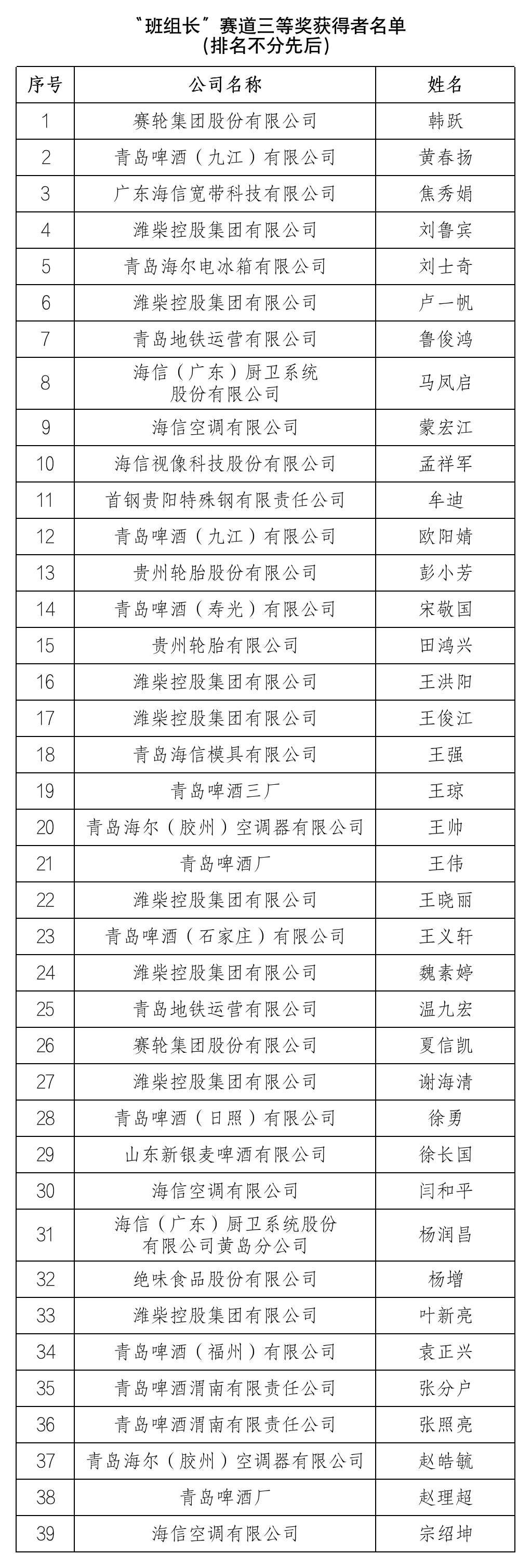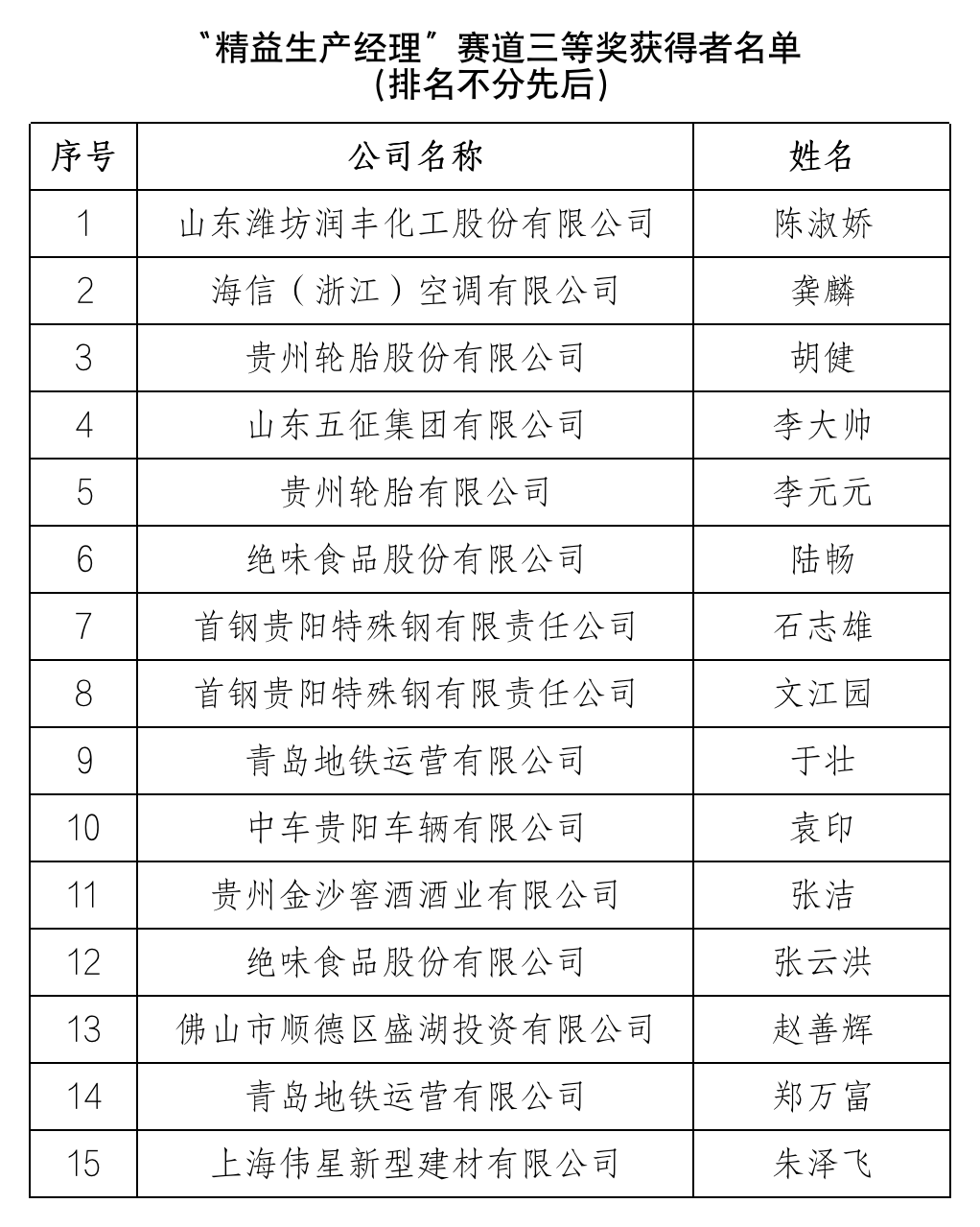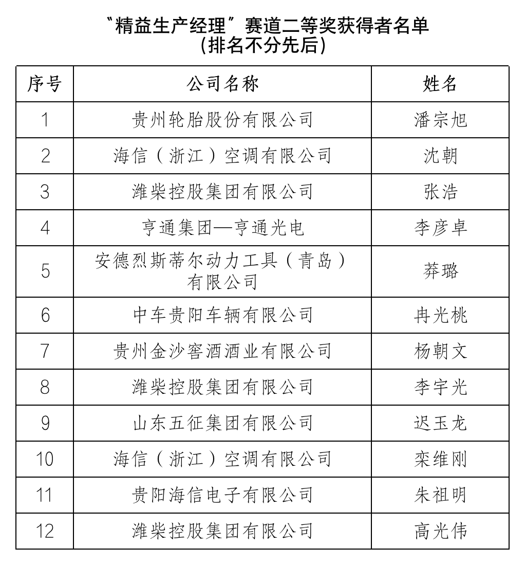 本次大赛最终产生了“班组长”赛道:一等奖15名,二等奖25名,三等奖39名;“精益生产经理”赛道:一等奖10名,二等奖12名,三等奖15名。同时大赛评选了优秀组织奖、优秀赛区组织奖、优秀组织个人奖、突出贡献奖及团体优胜奖的奖项。