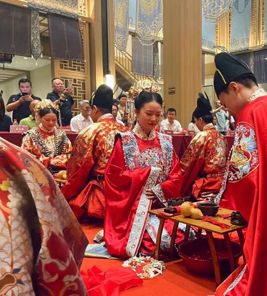 在启唐城古韵唐风的实景建筑、人文环境中,传统中式装扮的集体婚礼新人们行汉唐婚礼中却扇、拜谢、沃盥、同牢、合卺、结发、执手、签订婚书等传统中式礼仪,整个过程圣洁而隆重,热闹却俭约,十分符合当下年轻人朴实又真挚的婚嫁观。新人们的父母也表示,这样引领时代新风的新中式婚礼为几代人都减轻了压力,婚后的年轻人也能更幸福的进入未来的新婚生活。