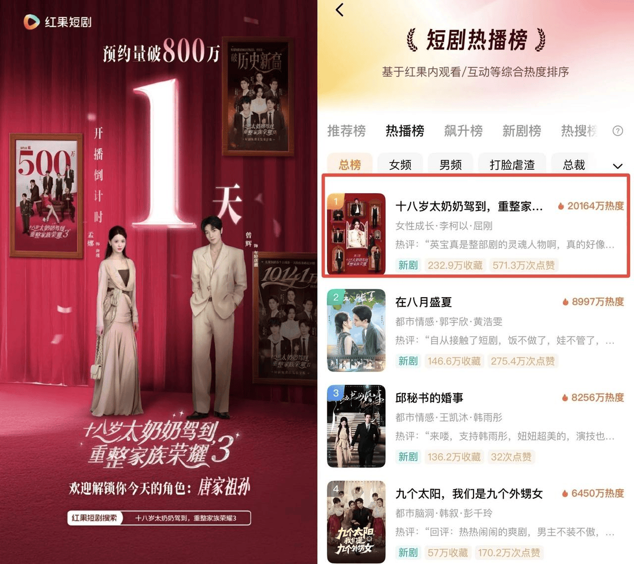 更绝的是每一季还有新太孙加入“纪家男模”战场,《太奶奶3》开播前就已经吸引了超800万预约,开播一天红果热度即破2亿、点赞近600万,剧集相关话题拿下抖音、微博多个热搜……这肉眼可见的泼天热度,谁不想接?剧粉们有福了,在红果追剧还能接太奶奶在线发福利。