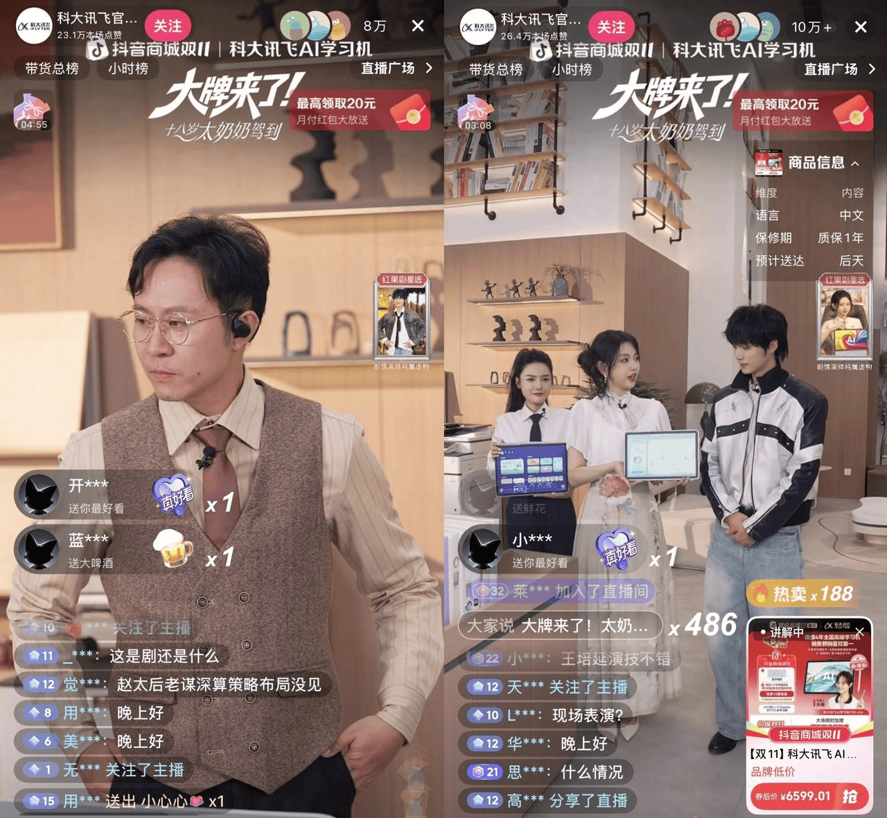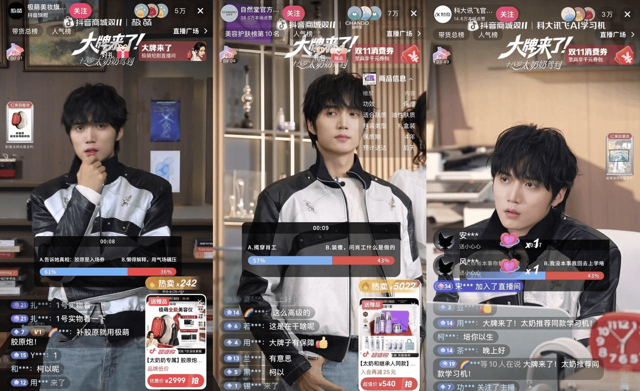 互动之后跳出的品牌优惠就像解锁故事彩蛋一样自然。科大讯飞AI学习机破解难题时,大家都在玩“纪总缺家教吗?”的梗;看到极萌胶原炮的即时效果,弹幕和评论区直接开始“求同款锋利下颌线”……品牌在故事中自然露出,解决痛点的同时完成种草,将更多用户分流引向各个品牌直播间。