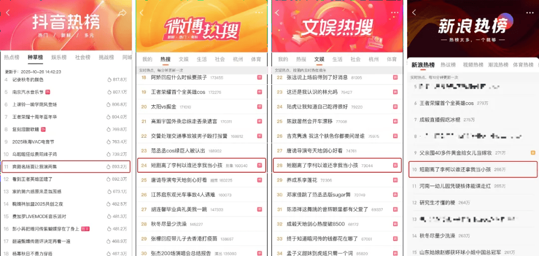 在10月26日《太奶奶3》正式上线、同时也是直播当天,剧集流量大爆发。各路达人自发二创《太奶奶》名场面。#爽剧名场面让我演两集 冲上抖音热榜11名,影响力还进一步外溢到全域,#短剧离了李柯以谁还拿我当小孩#在新浪热榜冲到第10位