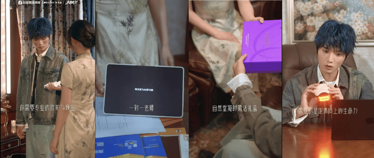 抖音商城联合薇诺娜、科大讯飞、自然堂、极萌四大品牌,首创性地把品牌直播间整个搬到《太奶奶3》的故事线里,开启一场“家族继承人试炼”。品牌好物则变身太奶奶帮助纪舟野反败为胜的武器,是解锁故事的关键“戏眼”。