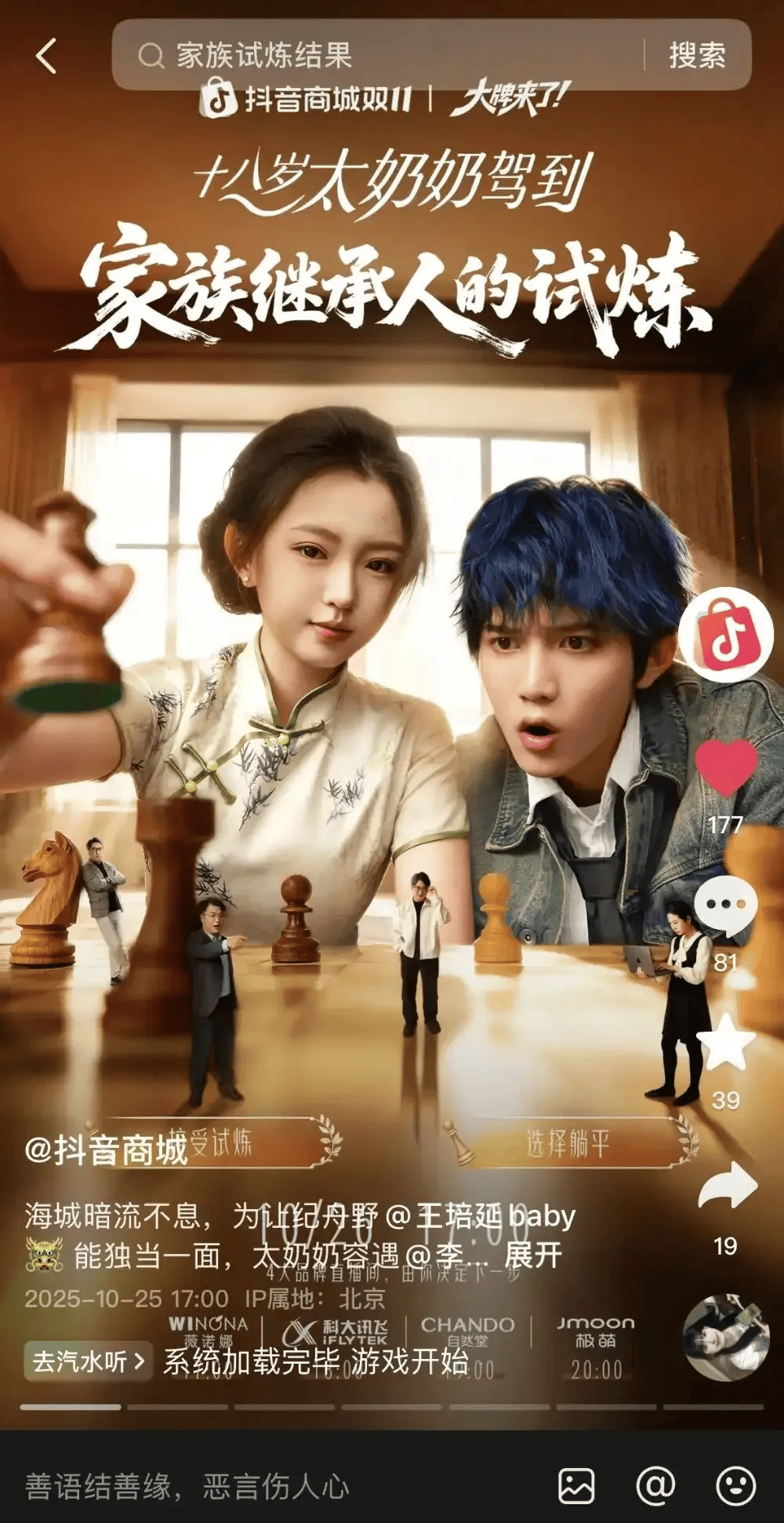 抖音商城是懂押宝的,一把就抓住了《太奶奶3》这顶级IP的情绪流量,把品牌完美“嵌”进了爽剧的基因里。剧粉们看完《太奶奶3》的失落还没来得及发作,新鲜的故事就安排上了;弹幕里“给我演”的呼声刚落,实时投票决定故事走向的权限就到手了。好家伙,瞬间从屏幕外的“嗑学家”晋级成能左右主角命运的“幕后导演”了,真让我体验了一把太奶奶的掌权人生。