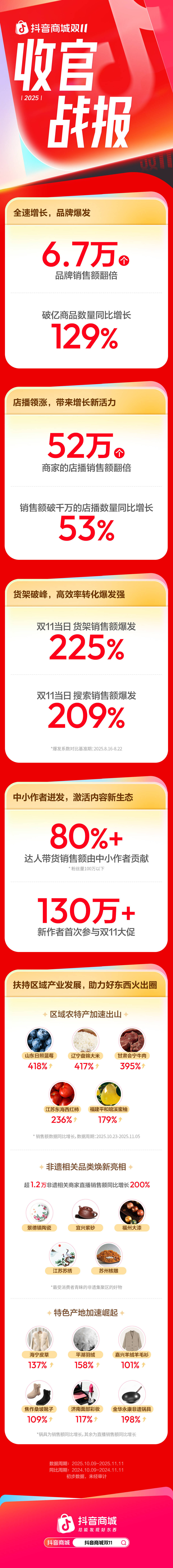 这一趋势直接反映在今年抖音电商达人直播的大盘数据上:本次双11,超过80%销售额由中小作者(粉丝量100万以下)贡献,130多万个新作者首次参与双11大促。这背后既是商家经营转向的体现,更是平台的流量机制更加普惠的痕迹。