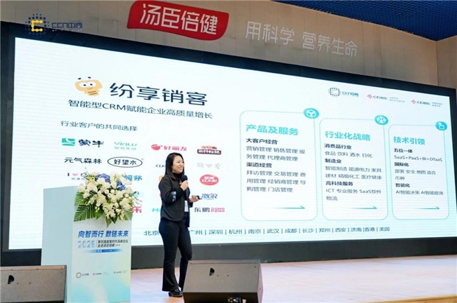 纷享销客快消事业部副总经理宋秀芳带来了题为《CRM与一物一码的全链路共振》的分享,指出企业可基于纷享销客CRM系统与CCN中商“一物一码”技术,实现从经销商、终端门店到消费者的全渠道数据贯通与业务协同。