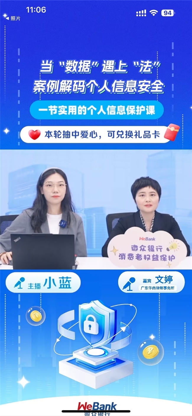 当前数字化浪潮下,个人信息已成为重要数字资产,却也面临着泄露、滥用等多重风险。为切实守护金融消费者合法权益,近日,微众银行推出“当数据遇上法:案例解码个人信息安全”专场直播活动。通过案例剖析与法律科普,向广大观众普及个人信息的重要性及分享个人信息保护秘籍,帮助消费者提升风险防范意识,筑牢数据安全防线。
