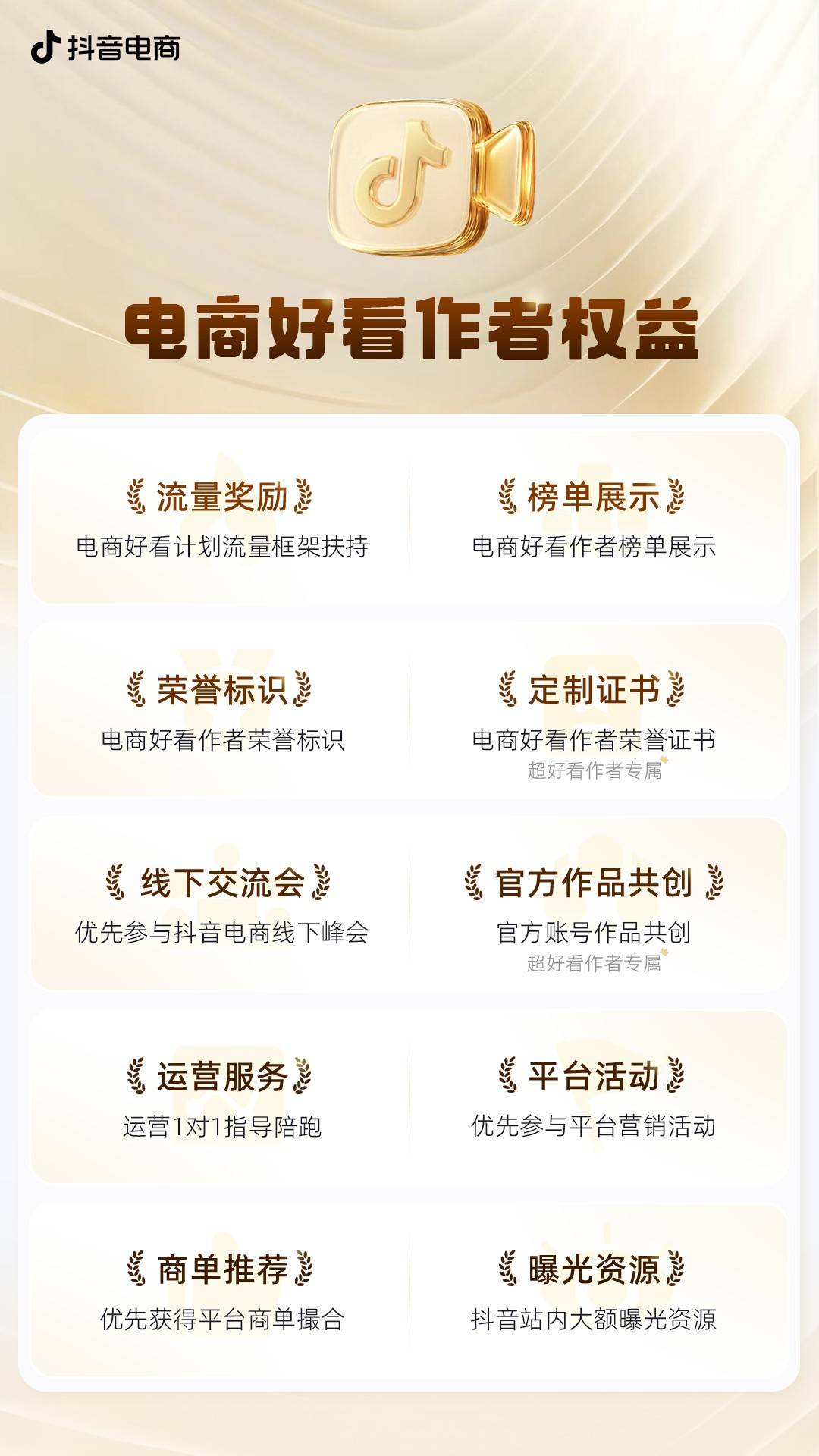 为持续激励优质创作者,抖音电商为入选的“好看作者”提供全方位成长支持——十大权益激励,涵盖荣誉激励、流量扶持、运营服务与商业机会等维度。