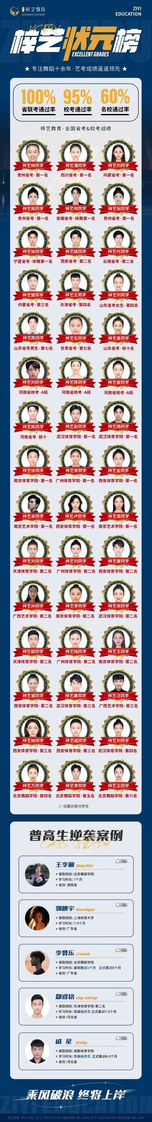 梓艺教育在艺考领域深耕10余年,名校成绩遥遥领先,成绩斐然,创办以来我们培养出多名省考状元, 并凭借99.99%联考通过率、95%校考通过率、60%名校通过率赢得到学生与家长的一致好评。