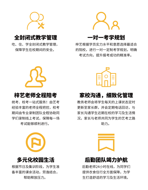 梓艺教育所有校区,均为吃、住、学一体化全封闭式管理模式!毗邻全国各省知名艺术高校,为家长和学生提供更多校区选择,让大家可以足不出省,即可享受北京一线的教学资源和名师指导。