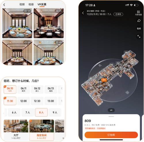 徐记海鲜CEO徐丹表示,VR实景餐厅试点期间,门店的日均包间订单量增长了38%,甚至有些消费者看了包间VR展示后,直接咨询年夜饭预订。VR预订可以让门店把空间、场景、服务打包到线上展示、售卖,对于餐饮堂食经营十分重要。