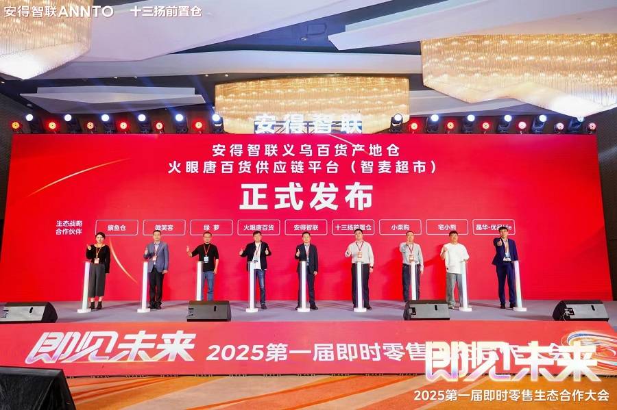 在现场嘉宾的共同见证下,安得智联快消经销行业总监季辉、十三扬前置仓主理人兼青芽集总经理阮扬、火眼唐百货董事长范志坚、旗鱼仓营销总监黄夏、微笑客创始人谢嵇怀、绿萝总经理张静波、小柴购供应链副总经理陈红均、宅小熊创始人郑来慧、晶华总经理聂飞一同登台,携手启动“安得智联义乌百货产地仓,火眼唐百货供应链平台(智麦超市)” 。各方以携手之姿、共创之力,共同迈向即时零售供应链协同共赢的新征程。