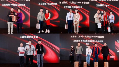 年会期间设置了三轮抽奖环节,奖品涵盖丝巾、非遗糕点、安化黑茶、化妆品礼袋、音箱、苏博联名礼盒、冻干粉套盒、迪士尼被子、永丰源先生杯、石头扫拖洗一体机、紫砂壶、高端天然磷脂、生态蔬菜大礼包、光子嫩肤体验、霍山石斛礼盒、除螨仪、红酒、直饮净水器、车头枕+腰靠套装、普洱茶、玉石项链、私董会入场券、走进企业专项赋能私董会名额、iPad、今世缘封坛酒、高端床垫、苏绣桑蚕丝被、翡翠挂件、大红酸枝台屏、苹果手机、男士手表等,共计130余个中奖名额,让现场企业家收获满满惊喜。