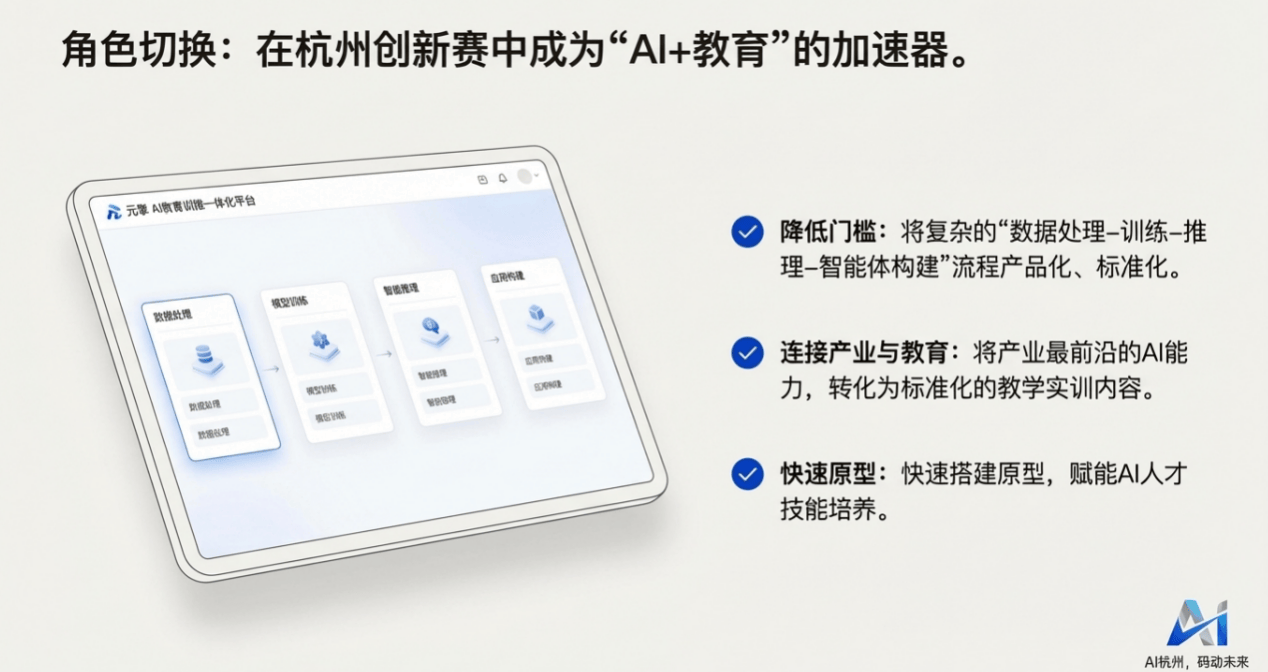不是通用大模型,也不是散点应用,而是把大模型按产业需求拆解成多个专家模块(MoE),再针对具体场景(交通、港口、产线、教育)组合调用。比如:对中铁/中交:【AI+交通】提质增效;对宁波:【AI+化工】直接对化工说话;对杭州创新赛:【AI+教育】模块,快速搭建原型,让本地部署的AI人才技能快速get。【AI+N产业场景】一套底层架构,多套专家组合——这解释了为什么能同时应对不同赛场。