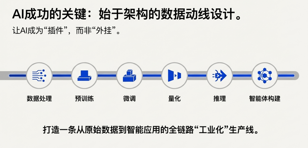 更关键的是数据动线设计/全链路“工业化”生产线。很多AI方案死在“数据进不来、出不去”,开元云在架构层就设计好耦合点,让AI不是外挂,而是插件。打造了一条从原始数据到智能应用的全链路“工业化”生产线,涵盖“数据处理-预训练-微调-量化-推理-智能体构建”六大环节。平台不仅能帮企业把内部数据管好、用好,还能在合规脱敏后,让数据成为市场上可流通的高价值资产。