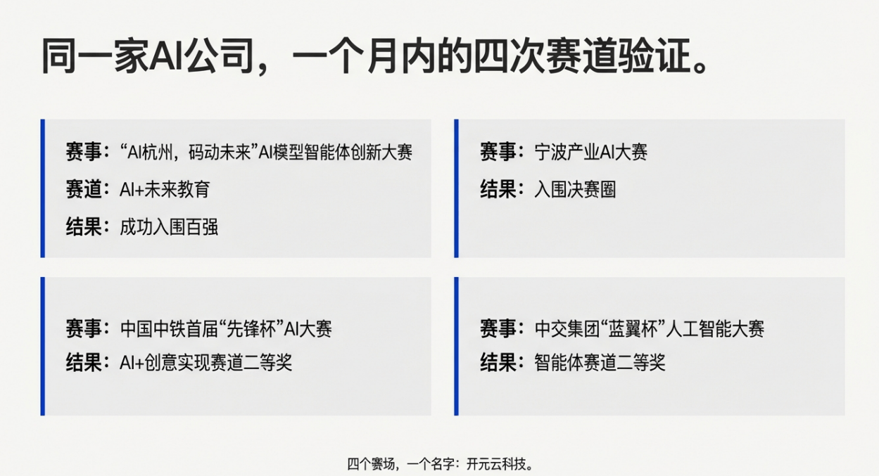 四个赛道,横跨了政府、产业、央企三大截然不同的应用逻辑,却同时把票投给了开元云科技。这不像巧合,更像某种信号。拆开看,这四个奖项恰好对应着当前AI落地的典型场景: