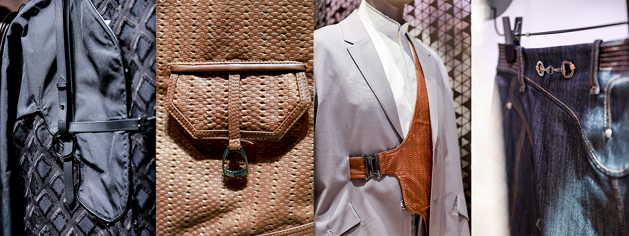 本季服饰以多面马元素织就主题表达:马鞍的经典轮廓化作衣身结构线条,硬朗廓形暗藏马术韵律;马衔扣幻为口袋装饰,金属质感点亮细节层次;马蹄铁元素则以精巧纹样缀于衣角,于不经意处呼应「马」的主题意象,让马术基因与东方衣装美学浑然相融。