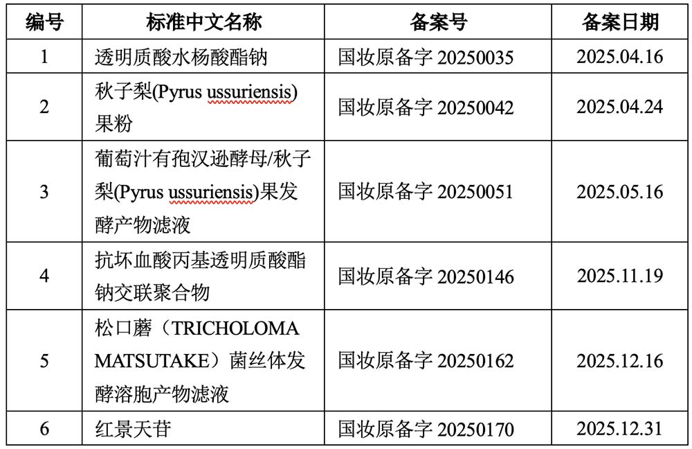 截止日前,华熙生物已完成12款化妆品新原料备案,2025年华熙生物完成了6款化妆品新原料备案(详见下表1)。