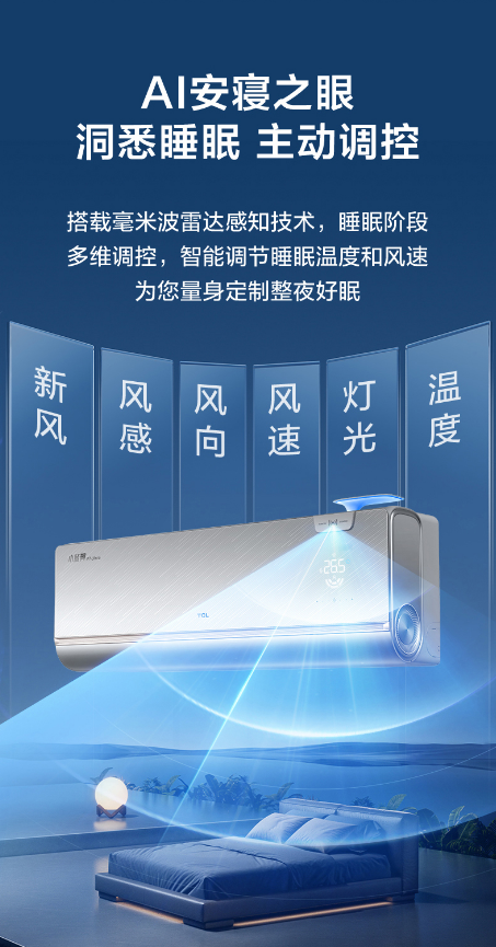 针对这种不同人群睡眠环境需求不同的问题,TCL小蓝翼P7 Ultra AI健康空调搭载的“安寝之眼”睡眠科技,通过搭载毫米波雷达感知人体微动量,结合AI算法来判断睡眠的质量,调节睡眠温度曲线,还能联动静音、新风、柔风和灯光调节,打造“零存在感”睡眠环境。