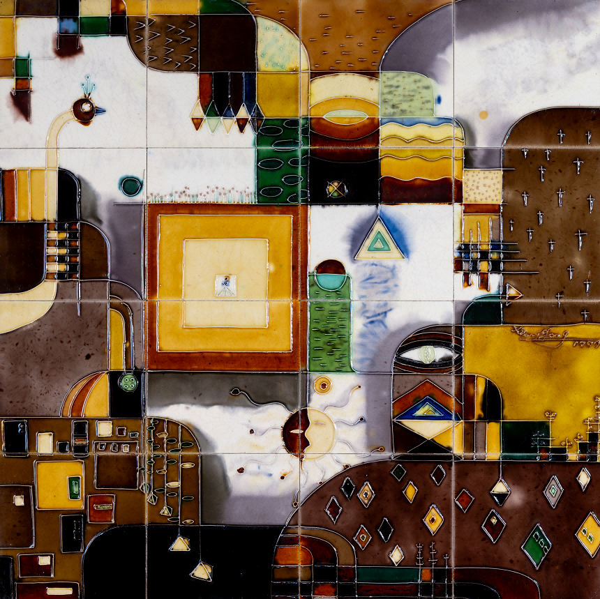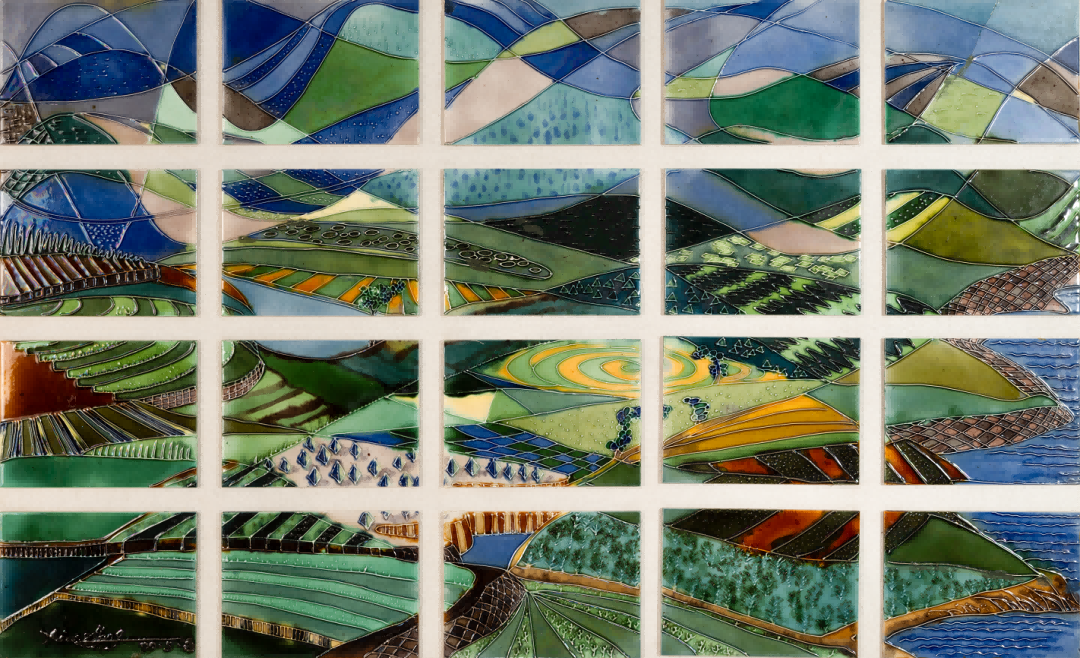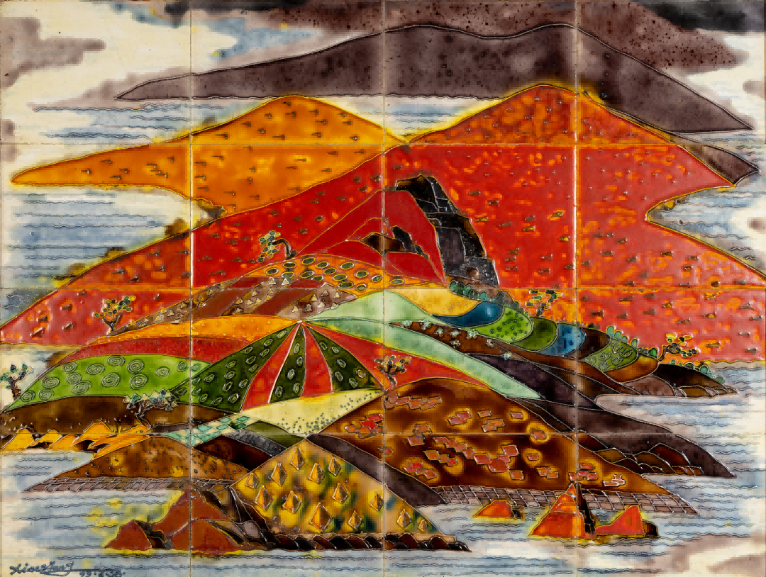 釉的本质属于陶瓷,是外在的视觉元素。独具的光泽、色彩、纹饰、肌理和天然装饰性,是釉的质与色之美。唐代工匠为获得理想的釉色,耗尽其毕生智慧,终于创造出登峰造极、华丽润泽的三彩釉。此釉既然可以作为陶瓷的外装饰,为何不能将其平面绘画呢?1982年,原中央工艺美院肖惠祥老师于《美术》第9期发表《用唐三彩做平面画》的文章,其三彩平面画作品虽赴美无果,但三彩瓷砖釉烧工艺在我国北方却已广泛流行。