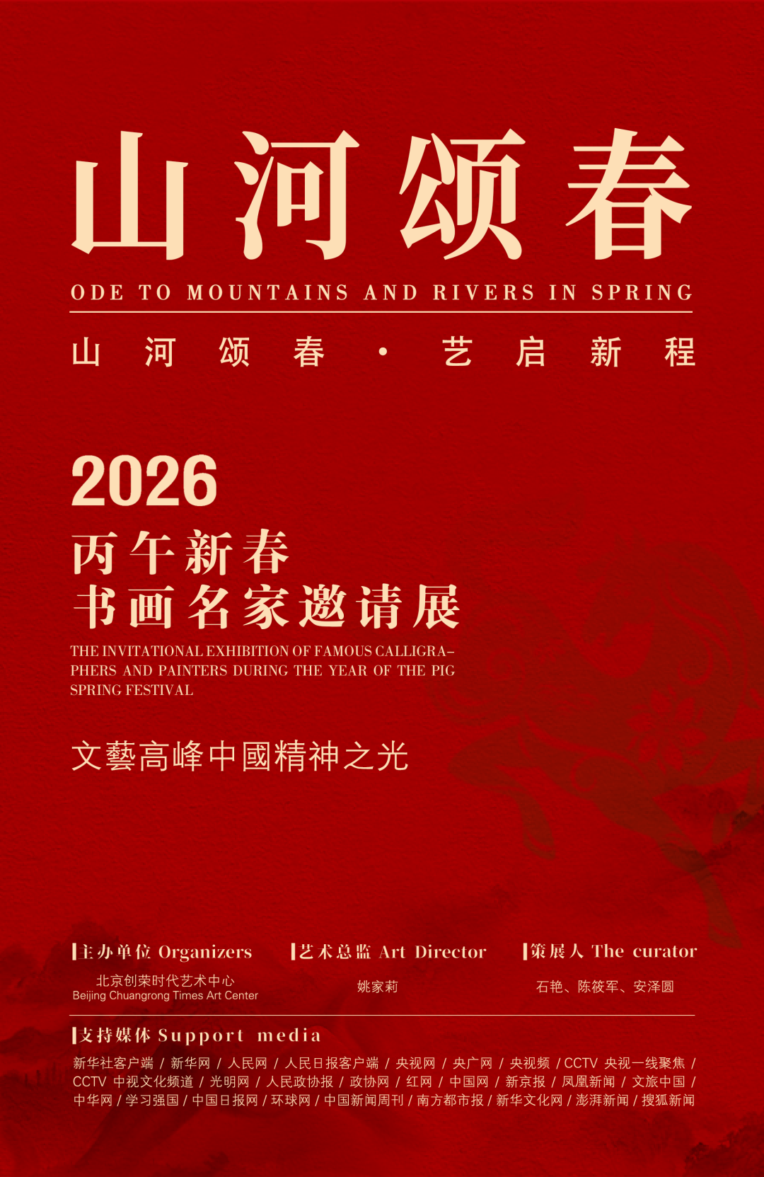 值此丙午新年,我们以艺术为媒,寄望观者在作品的沉浸体验中,触摸中国精神的深层脉络,感受传统与现代对话的温度。愿这场展览不仅是一次视觉盛宴,更能成为一次精神的唤醒 —— 让山河的回响在心中激荡,让春的生机在笔下延续,让艺术的光芒照亮文化自信的新征程。