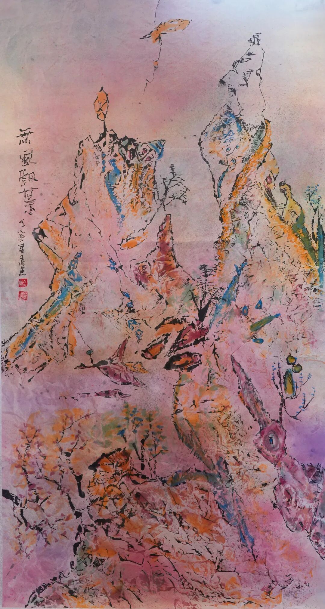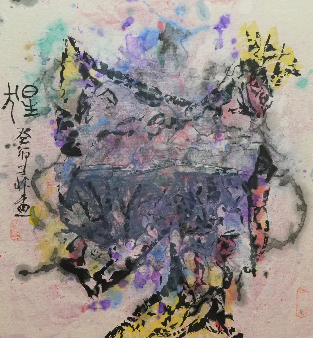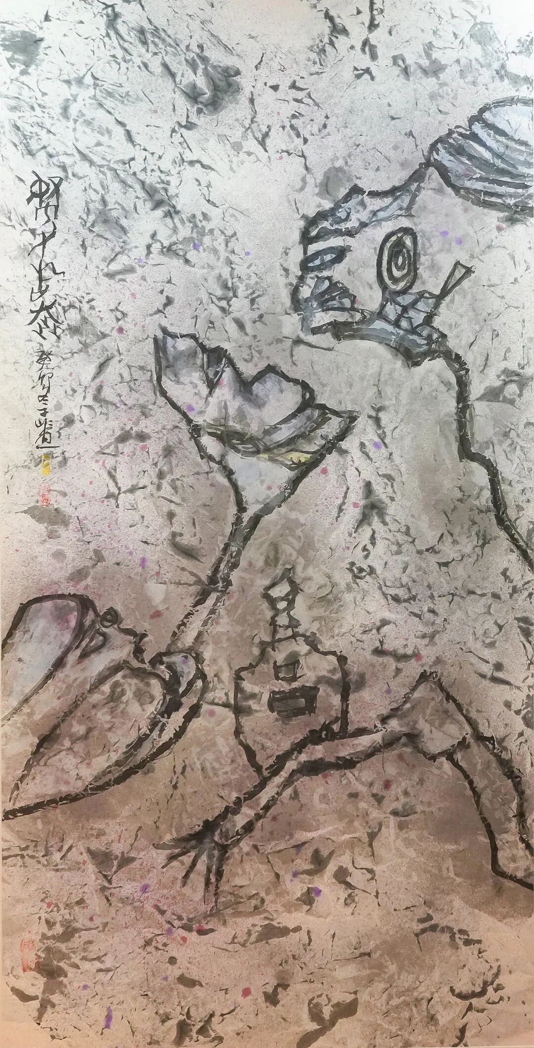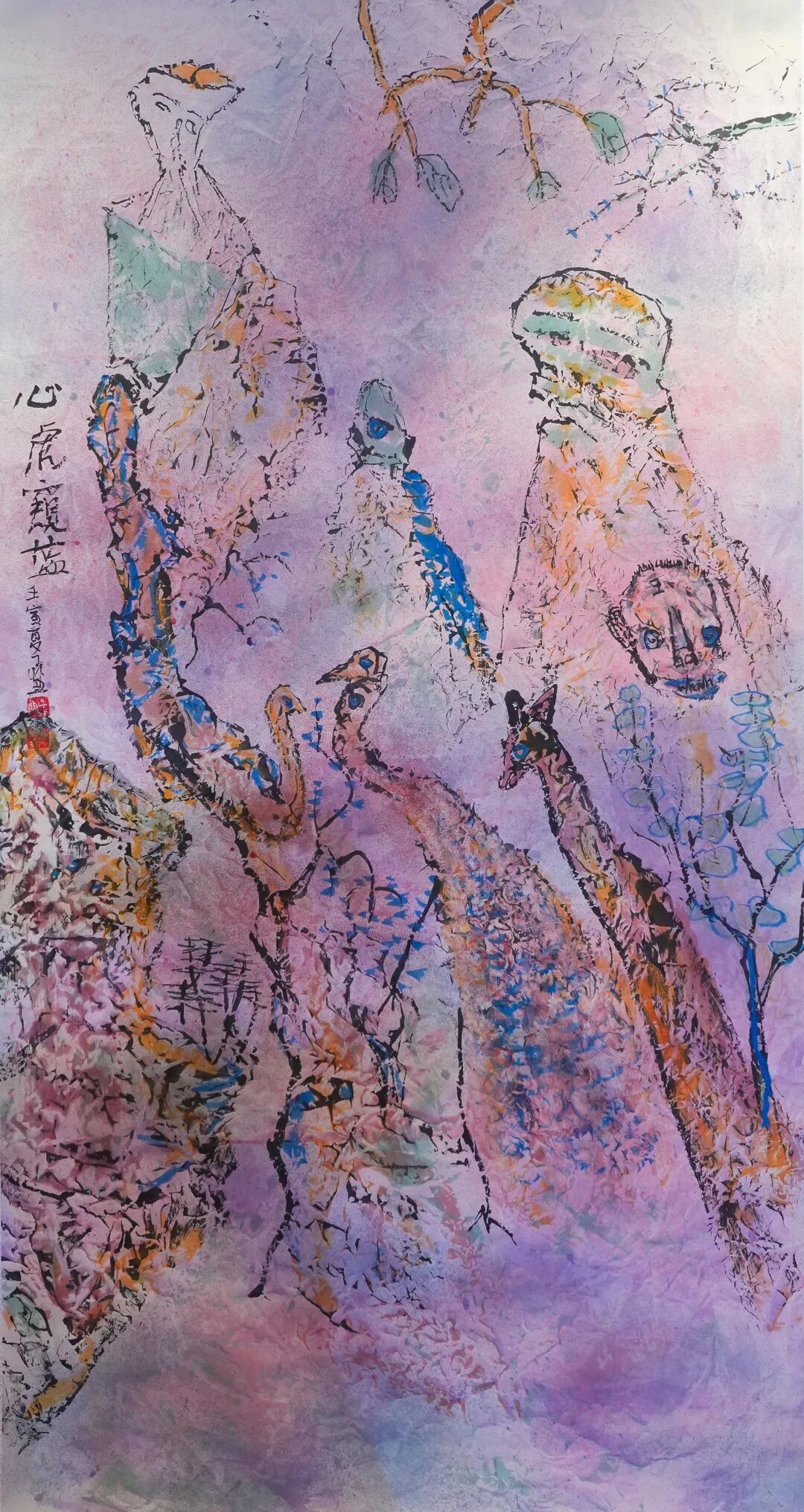 廖清生先生在创作中融合文学、哲学、宗教等多元文化元素,形成“重视生灵、窥视人心、化外宇宙”的独特艺术视角。其突破性在于打破了传统国画的诸多创作禁忌:山川河流可倒置旱现,树木山石能随意叠加,动物花鸟的布局突破时空限制,云雾水流的形态亦随意念自然变形。这种“杂乱有章、遵循无极、以无化无”的创作宗旨,使得不同时空的意念、情感与思想得以在同一画面中交织碰撞--无论是历史记忆、当下感悟还是未来哲思,皆可通过“意念同同框”的艺术手法实现跨维度对话。