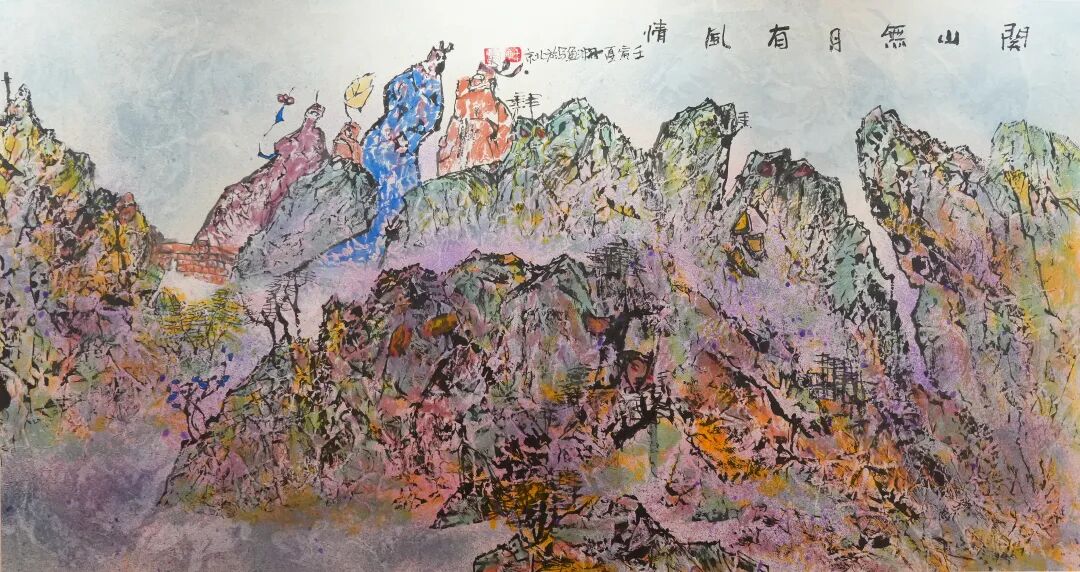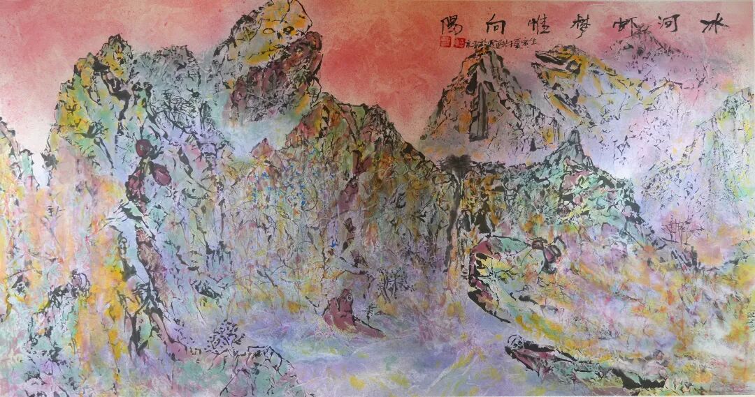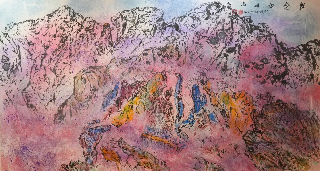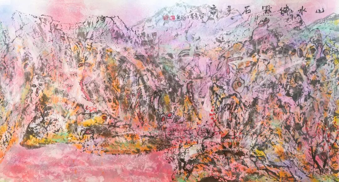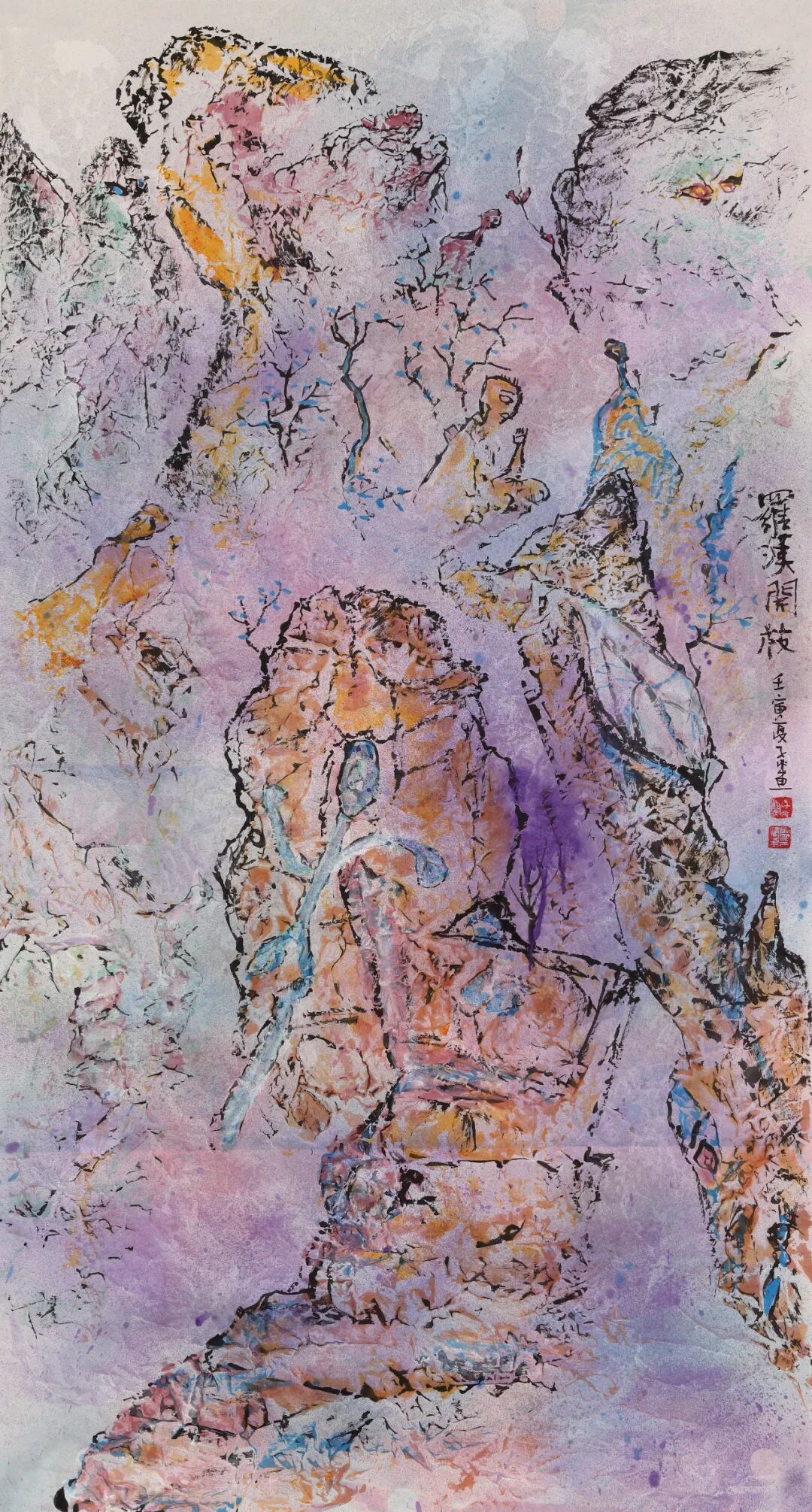 廖清生先生在创作中融合文学、哲学、宗教等多元文化元素,形成“重视生灵、窥视人心、化外宇宙”的独特艺术视角。其突破性在于打破了传统国画的诸多创作禁忌:山川河流可倒置旱现,树木山石能随意叠加,动物花鸟的布局突破时空限制,云雾水流的形态亦随意念自然变形。这种“杂乱有章、遵循无极、以无化无”的创作宗旨,使得不同时空的意念、情感与思想得以在同一画面中交织碰撞--无论是历史记忆、当下感悟还是未来哲思,皆可通过“意念同同框”的艺术手法实现跨维度对话。