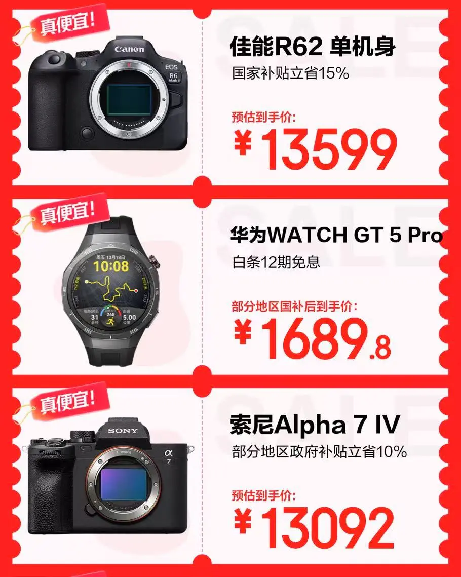佳能R62单机身拥有高达约2420万有效像素的全画幅高画质,助你轻松拍出动人高清大片,活动期间享国家补贴立省15%,预估到手价13599元。索尼Alpha 7 IV部分地区用户可享政府补贴立省10%,预估到手价13092元。华为WATCH GT 5 Pro既是运动利器,更是健康监测助手,部分地区国家补贴后到手价仅一千多起,叠加12期免息,入手更毫无压力。
