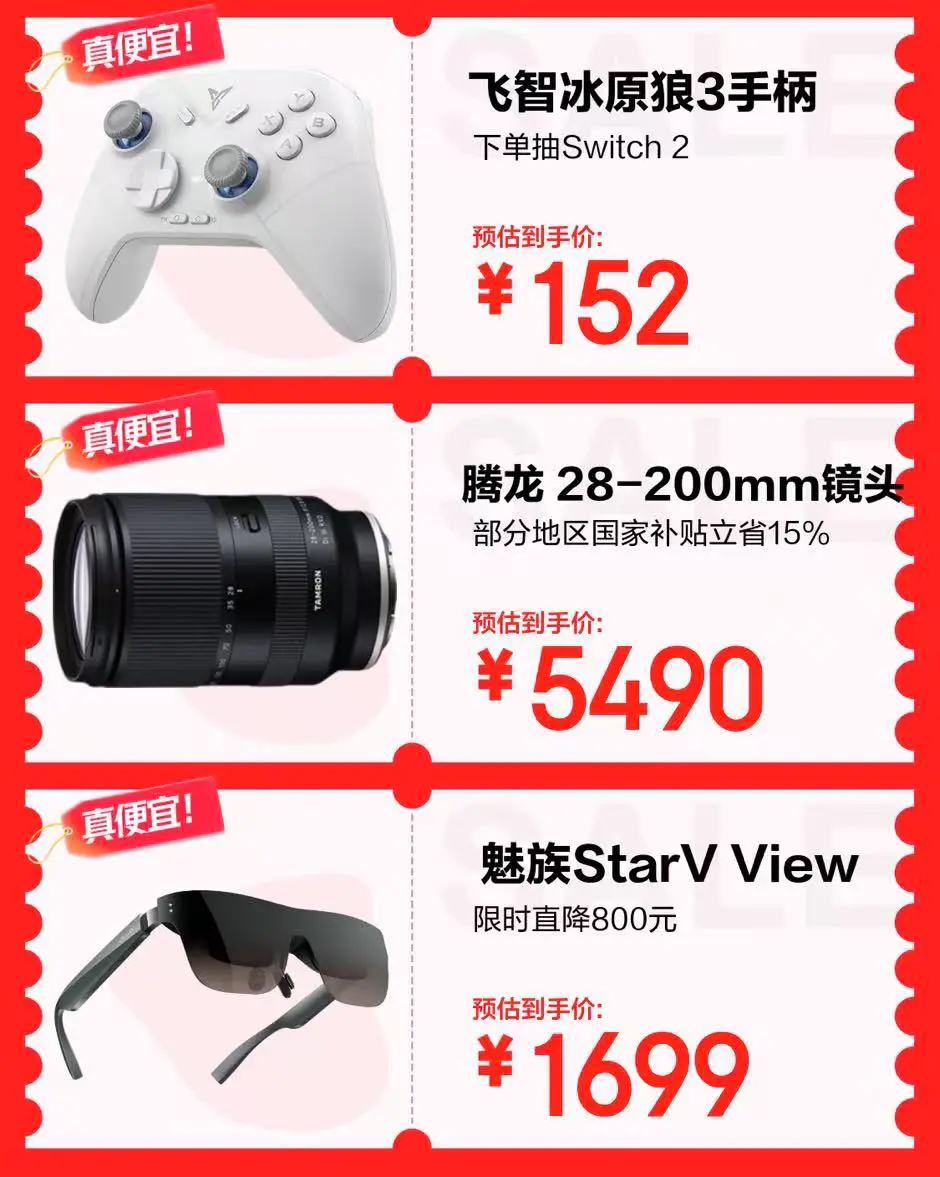 飞智冰原狼3游戏手柄采用自研杠杆摇杆设计,不漂移更顺滑,百元级价格助你畅享细腻游戏手感,下单即有机会赢取Switch 2。腾龙 28-200mm F/2.8-5.6 Di III RXD (A071) 镜头轻巧便携,多机型适配,部分地区享国家补贴直降15%,预估到手价5490元,立享全能焦段。魅族 Star View 搭载星野影音系统,专为打造沉浸式视听盛宴,活动期间限时直降800元,焕新价1699元,错过等一年。