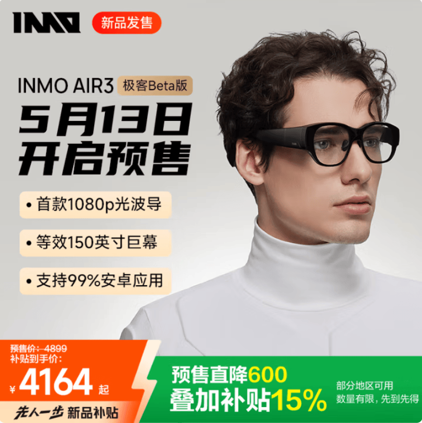 INMO AIR3 AR智能眼镜5月13日20点在京东先人一步开启预售,新预约用户可享晒单得至高100元E卡等新品10大权益,参与国补地区用户还可叠加国家补贴立省15%,数量有限,先到先得。快打开京东APP预约抢购,即刻开启智能生活!