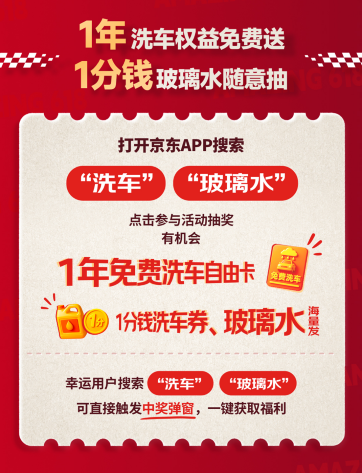 除0元汽车大奖外,京东汽车618还打造了覆盖买车、用车、养车全场景的超级福利矩阵。618期间,打开京东App搜索“洗车”“玻璃水”,参与活动抽奖即有机会获得1年免费洗车自由卡、1分钱洗车券、玻璃水等,幸运用户搜索时可直接触发中奖弹窗,一键解锁福利。