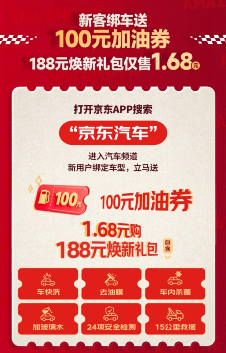 针对新用户,京东汽车618期间还派送“豪气见面礼”。用户打开京东APP搜索“京东汽车”进入汽车频道,完成爱车型号绑定即可秒领100元加油券,更可1.68元购买价值188元爱车焕新礼包,包含车快洗、去油膜、车内杀菌、加玻璃水、24项安全检测、15公里救援服务六大权益。